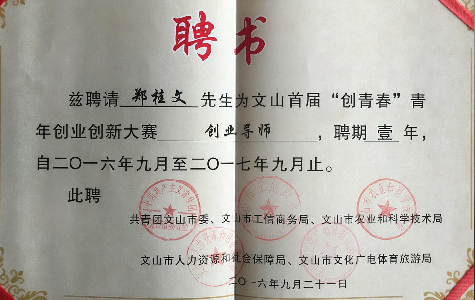 2016年9月21日10點,由文山市委副書記劉建萍同志宣布:文山市首屆‘創青春’青年創業創新大賽正式啟動,并為天度集團董事長鄭桂文等五位創業導師頒發了導師聘書。