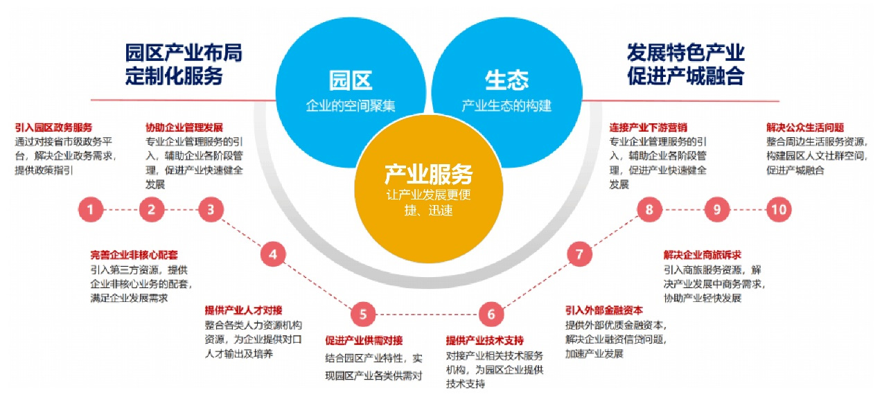 產業園區運營需要做到物業、商業與產業,“三業”相輔相成,協同并進,具有良好的產業支撐和配套條件,以產業鏈導向,各種生產要素重新整合,形成穩定的主導產業和具有上、中、下游結構特征的產業鏈。運營始終要圍繞產業,以產業集聚、產業生態的打造為終極目標,需要大數據的支撐來進行不斷地選擇與塑造,按市場化方式運營,建立以消費市場、企業需求為導向的反向研發機制,不僅要為入駐企業提供空間服務,更要在企業發展的各個時間段充當合伙人,與入駐企業共成長,幫助入園企業建立研發投入體系、質量品控體系、產品標準體系,為全產業鏈發展提供全方位的產業技術創新支撐。